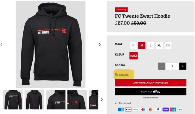 Bij elk product wordt de maattabel weergegeven. Dit is te vinden op elke productpagina onder de maatvoering, zoals in de onderstaande afbeelding: